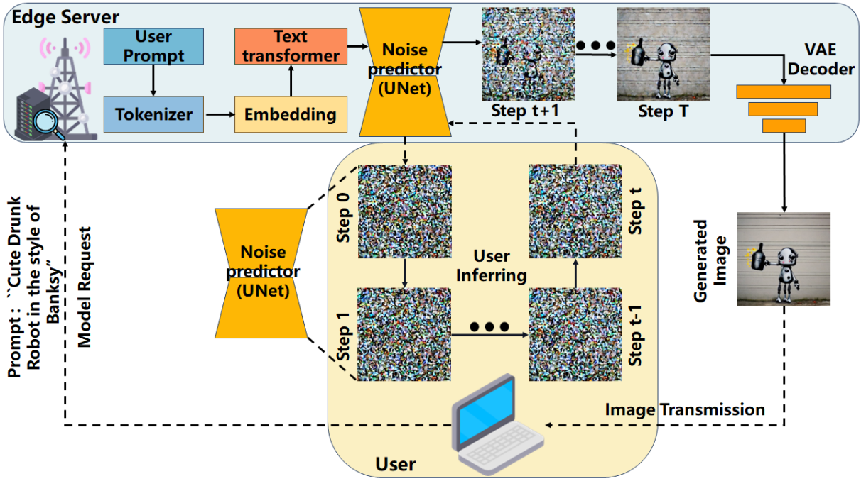随着生成式人工智能技术与边缘云网络的快速发展,AIGC服务的需求与日俱增,扩散模型凭借其强大的“文生图”的能力脱颖而出。然而,其较高的计算开销对用户设备构成严峻的挑战。为此,项目组提出了一种基于扩散模型的新型边缘用户协作推理框架,通过设备间的计算协作推理,减少了服务延迟、降低了网络资源消耗和用户计算资源消耗,同时提升了用户体验质量(QoE)。实验结果表明,该框架不仅能够生成高质量图像,还能显著节约图像生成时间,有效优化计算资源和网络消耗。