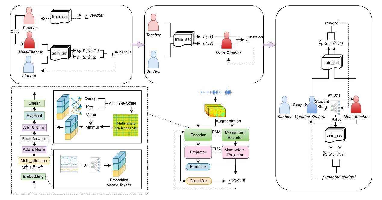 Transformer作为深度学习中的重要架构,凭借其强大的长序列依赖建模能力,在自然语言处理、计算机视觉等多个领域得到了广泛应用。然而,当前的Transformer架构在语音情感识别任务中表现欠佳,这主要是由于未对齐的时间戳以及不同变量间物理测量的差异,会导致注意力机制的无意义映射。同时,Transformer架构包含大量参数,需要消耗大量的计算资源,这使其难以在资源有限的环境中部署。此外,人类情感具有复杂性和模糊性,而现有的Transformer架构难以有效处理这种复杂的情感信息。为此,研究团队提出了一种知识蒸馏框架。具体而言,研究团队首先对教师模型进行微调,使其能够适应不同的语音情感识别任务。在员工模型中,将单个序列时间点嵌入到变量标记中,以此聚合全局语音表示。同时,结合监督对比损失和交叉熵损失,以增大可学习特征之间的类间距离。最后,采用元知识蒸馏与基于课程的知识蒸馏方法,提升员工模型的性能。实验结果验证了该方法的有效性。这一成果为推动语音情感识别领域的进一步发展提供了新的理论框架。